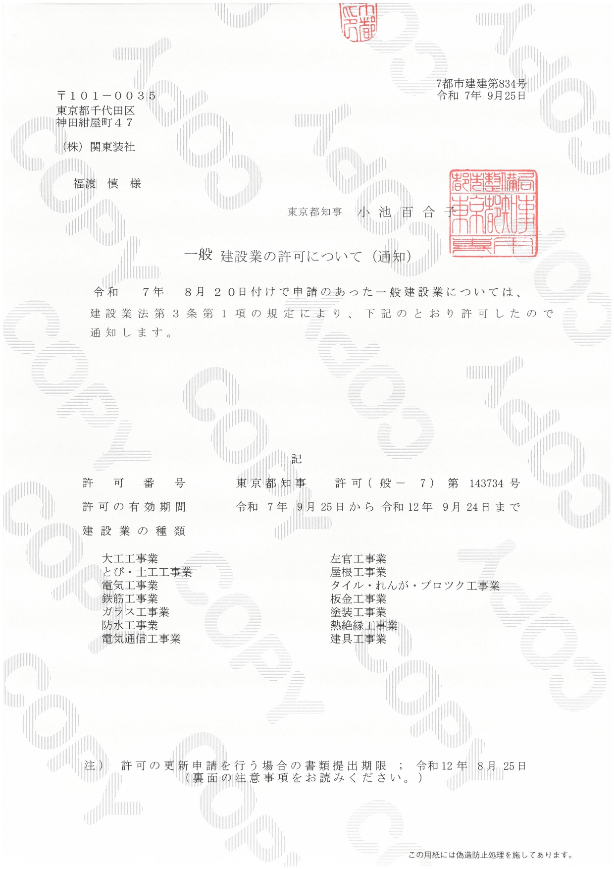 | 建設業許可 | 東京都知事 許可(特-5)第143734号 |